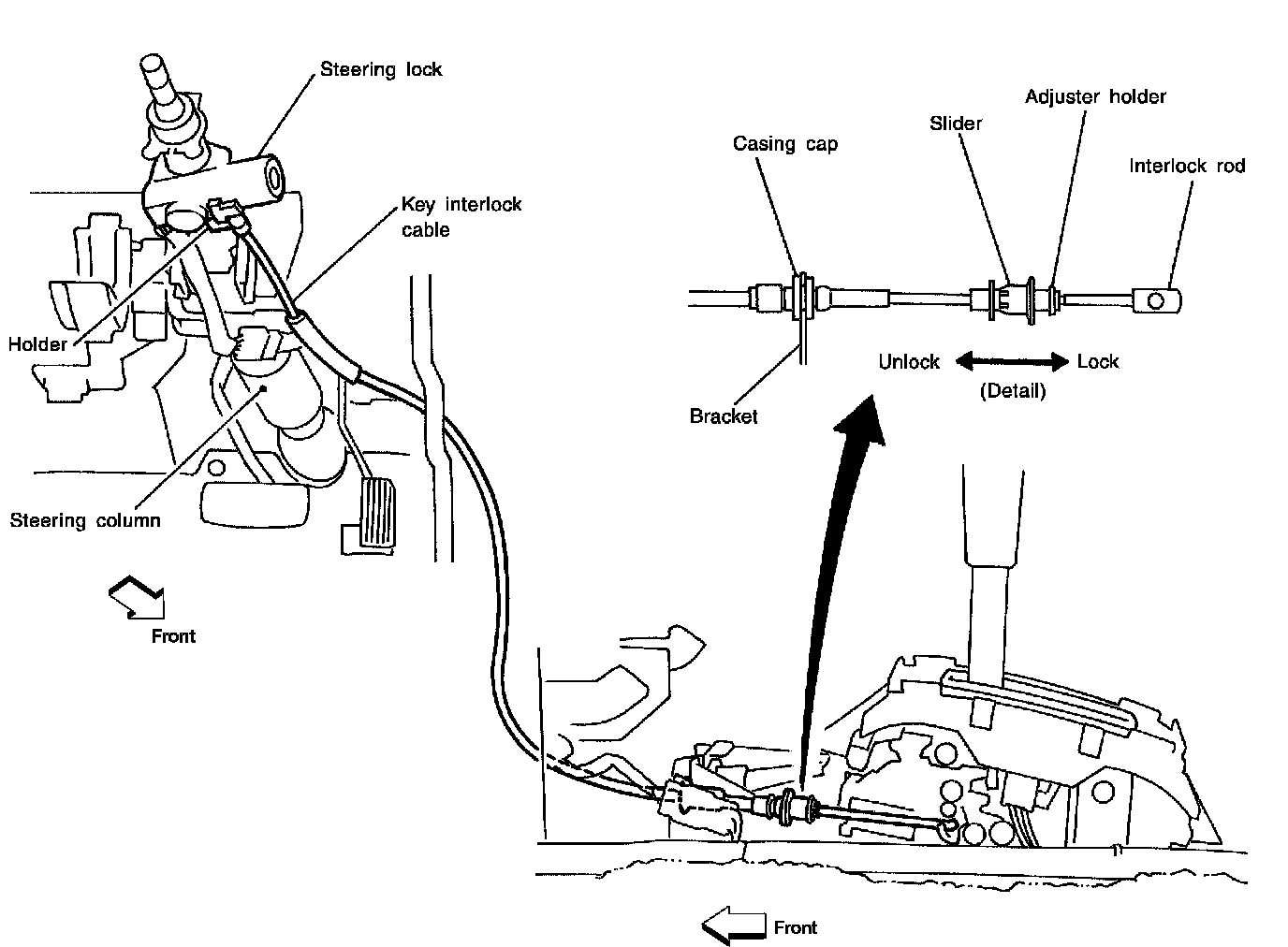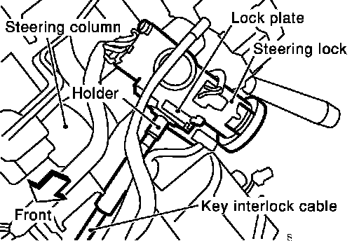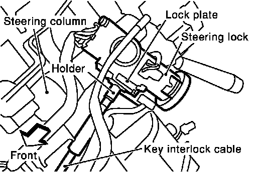 2. Remove lock plate from steering lock assembly and remove key interlock cable.