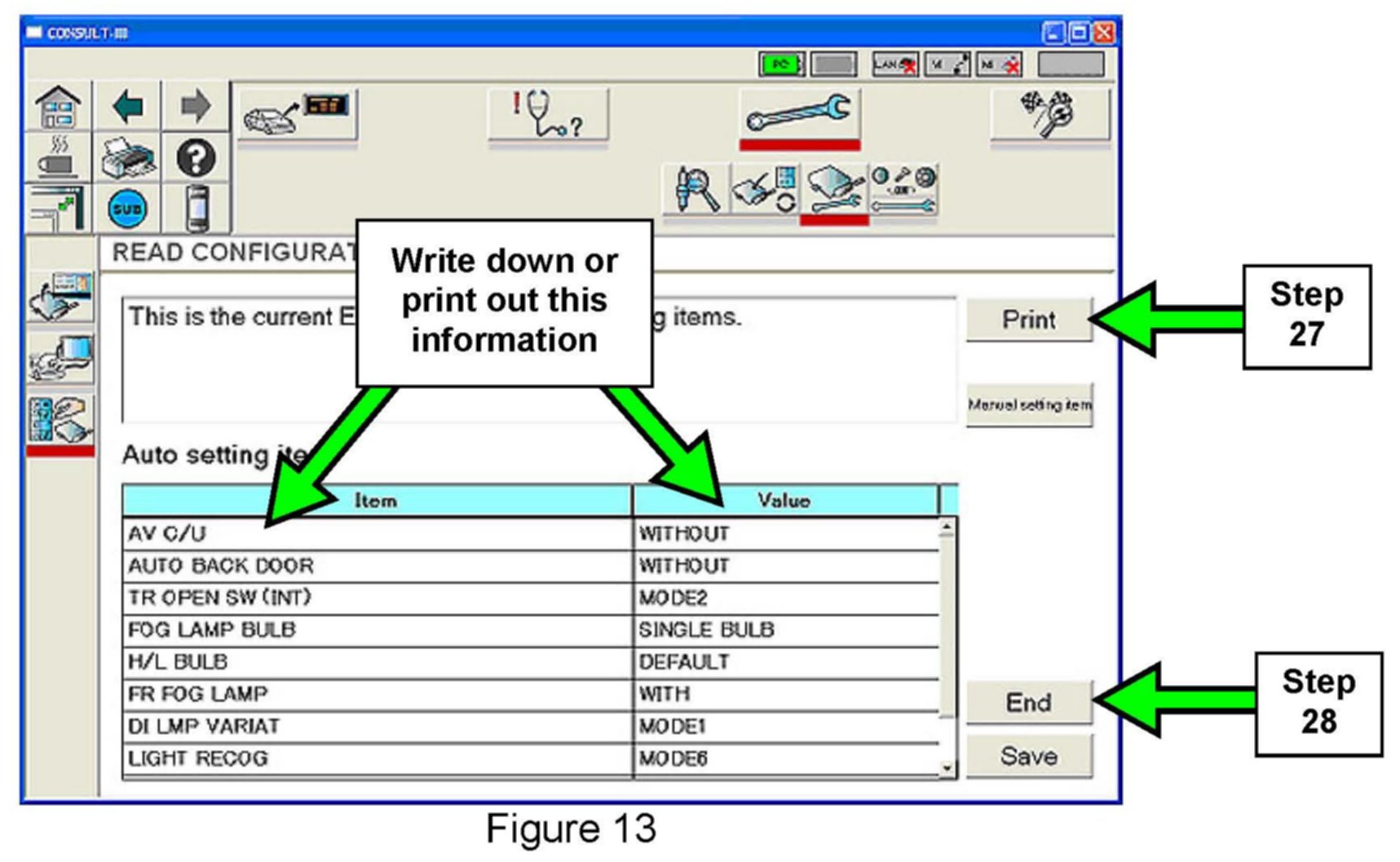 27. Write down or print out all the auto setting items and values. (See Figure 13.)