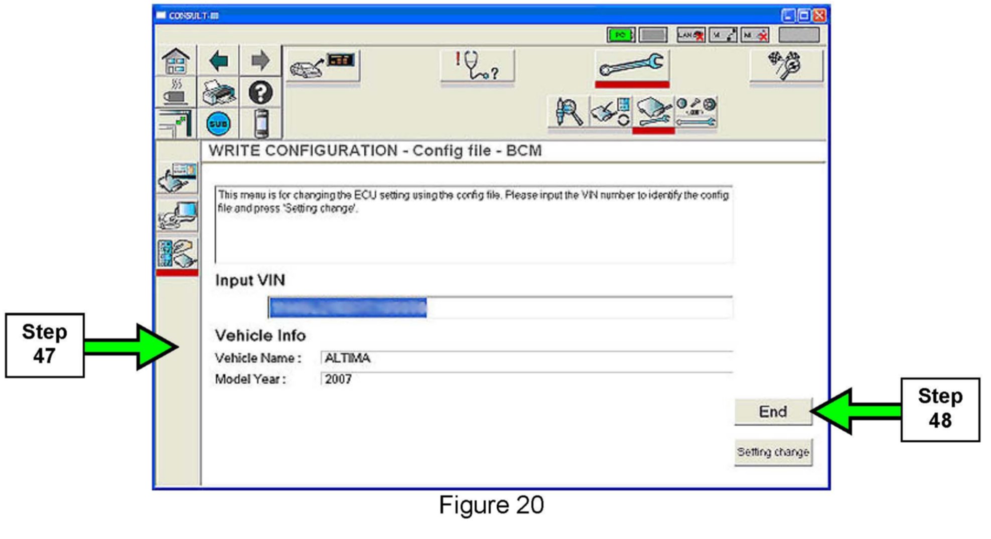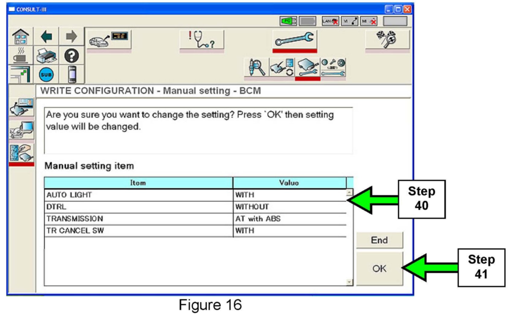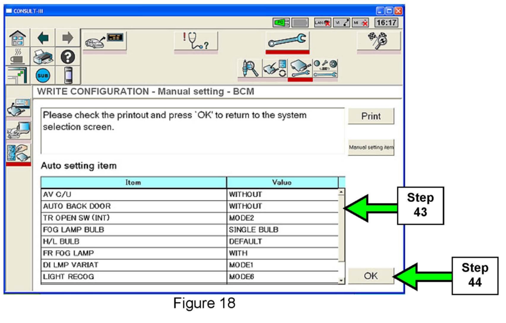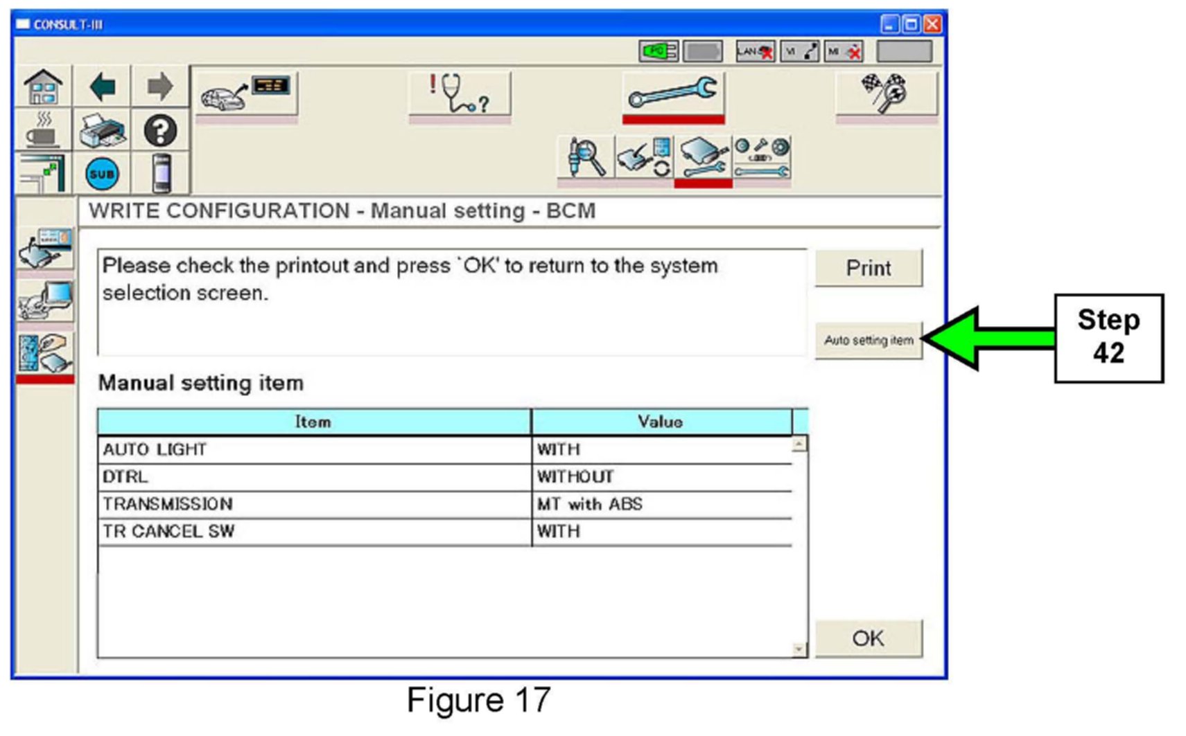 38. Configure the new BCM using the manual setting items and values you wrote down or printed out in step 25.