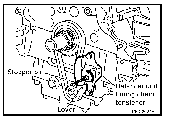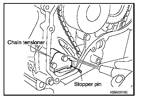 - After installing chain tensioner, remove stopper pin, and make sure the tensioner moves freely.