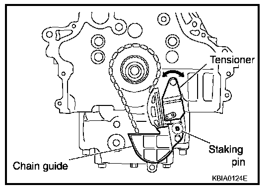NOTE: Chain guide and tensioner move freely with the staking pin as the axle. Therefore, bolt hole position of the three points could be changed during removal. If points change, temporarily tighten the two bolts on the chain guide and move the tensioner to match the bolt holes.