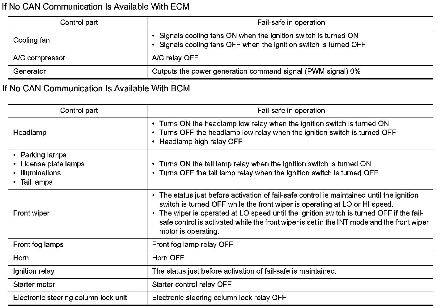 When CAN communication with ECM and BCM is impossible, IPDM E/R performs fail-safe control. After CAN communication recovers normally, it also returns to normal control.