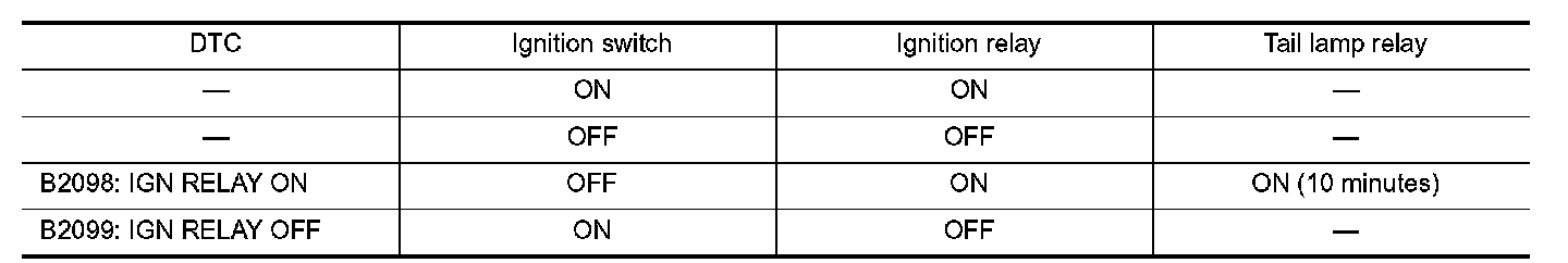 - If the ignition relay cannot turn OFF due to contact seizure, it activates the tail lamp relay for 10 minutes to alert the user to the ignition relay malfunction when the ignition switch is turned OFF.