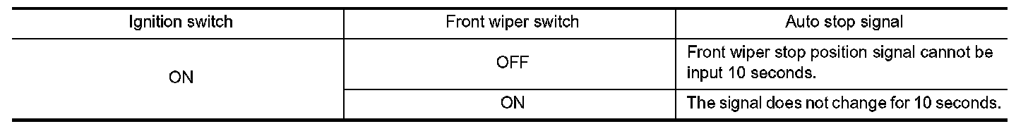 When a front wiper auto stop signal is in the conditions listed as given, IPDM E/R stops power supply to wiper after repeating a front wiper 10 second activation and 20 second stop five times.