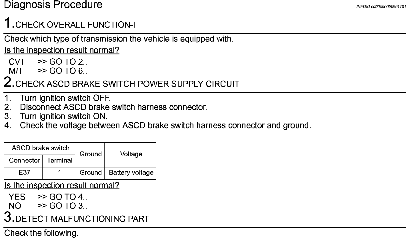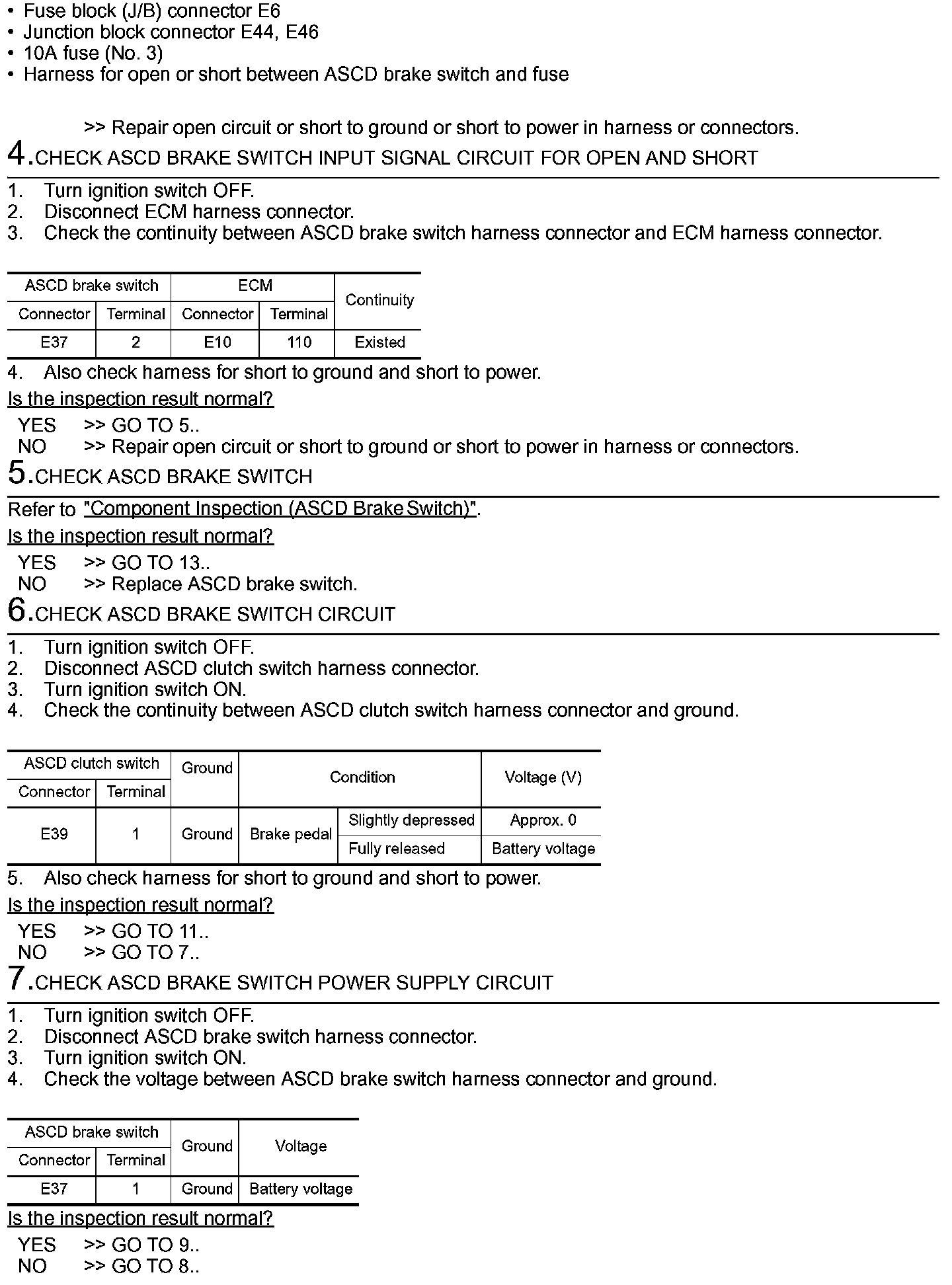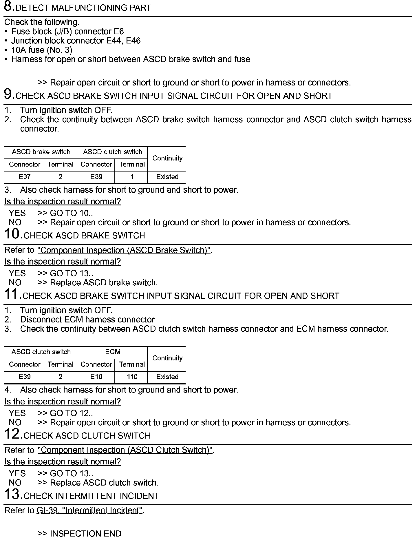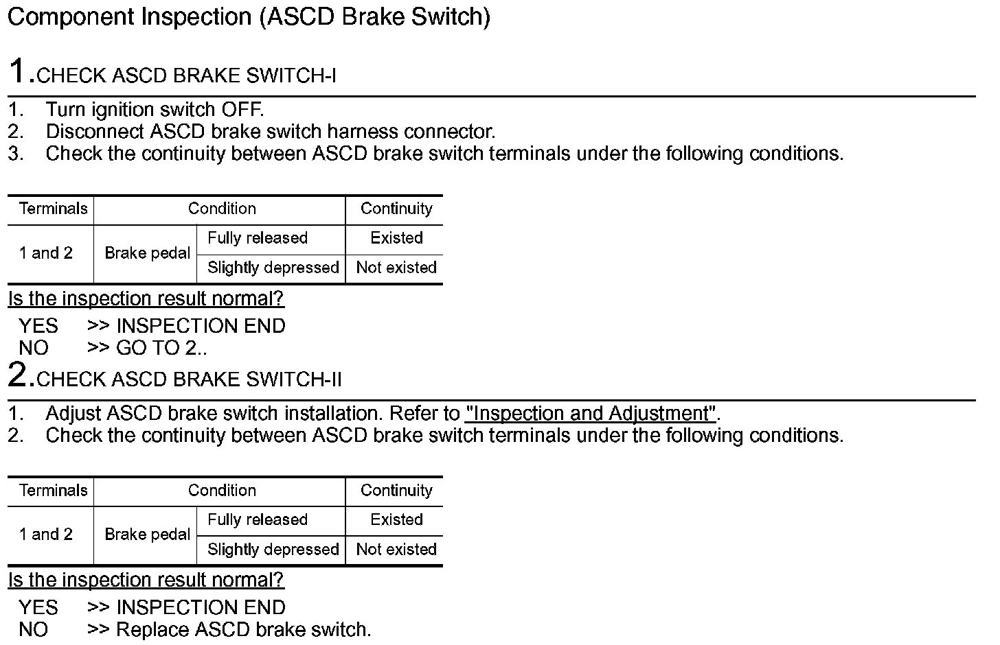 When the brake pedal is depressed, ASCD brake switch is turned OFF and stop lamp switch is turned ON. ECM detects the state of the brake pedal by this input of two kinds (ON/OFF signal).