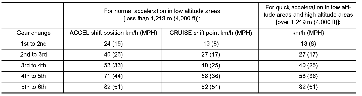 Shown are suggested vehicle speeds for shifting into a higher gear. These suggestions relate to fuel economy and vehicle performance. Actual upshift speeds will vary according to road conditions, the weather and individual driving habits.