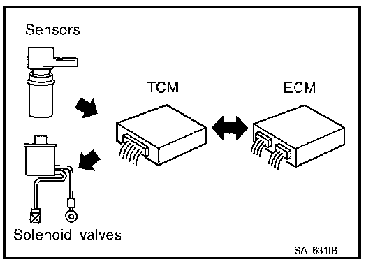 The TCM also communicates with the ECM by means of a signal sent from sensing elements used with the OBD-related parts of the CVT system for malfunction-diagnostic purposes. The TCM is capable of diagnosing malfunctioning parts while the ECM can store malfunctions in its memory.
