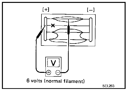 2. Attach probe circuit tester (in Volt range) to middle portion of each filament.