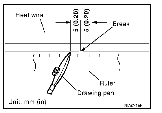 3. Place ruler on glass along broken line. Deposit conductive silver composition on break with drawing pen. Slightly overlap existing heat wire on both sides [preferably 5 mm (0.20 in)] of the break.