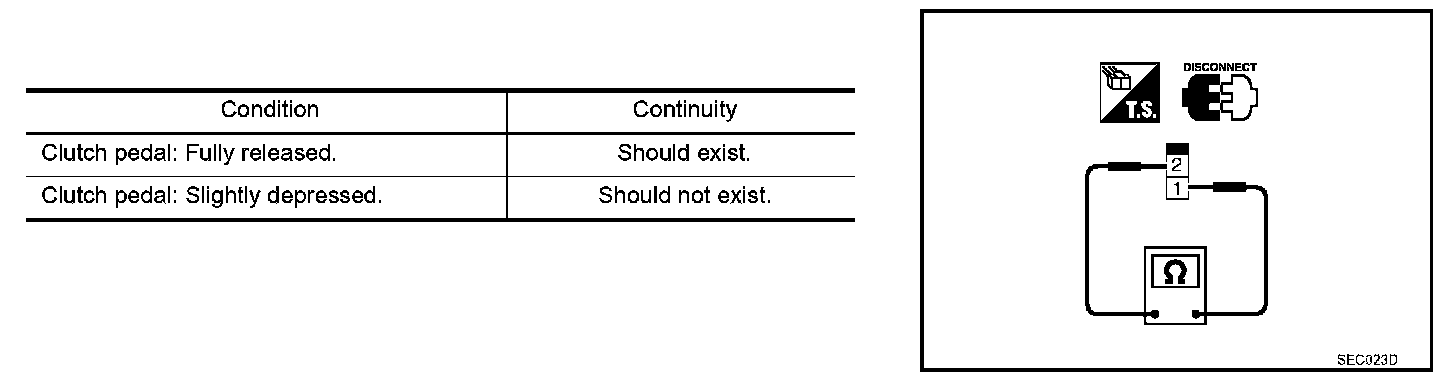 3. Check continuity between ASCD clutch switch terminals 1 and 2 under the given conditions.