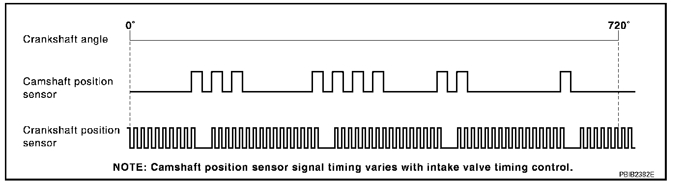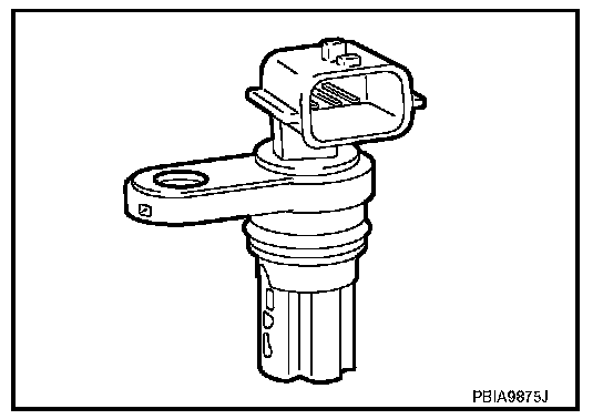 The camshaft position sensor (PHASE) senses the protrusion of camshaft (INT) to identify a particular cylinder. The camshaft position sensor (PHASE) senses the piston position. When the crankshaft position sensor (POS) system becomes inoperative, the camshaft position sensor (PHASE) provides various controls of engine parts instead, utilizing timing of cylinder identification signals. The sensor consists of a permanent magnet and Hall IC. When engine is running, the high and low parts of the teeth cause the gap with the sensor to change. The changing gap causes the magnetic field near the sensor to change. Due to the changing magnetic field, the voltage from the sensor changes.