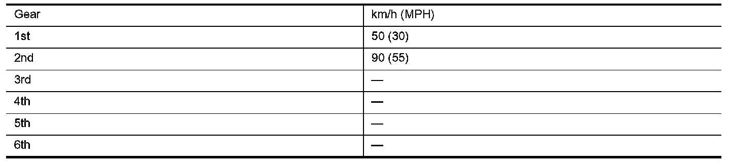 Do not exceed the maximum suggested speed (shown in the table) in any gear. For level road driving, use the highest gear suggested for that speed. Always observe posted speed limits and drive according to the road conditions to ensure safe operation. Do not over-rev the engine when shifting to a lower gear as it may cause engine damage or loss of vehicle control.