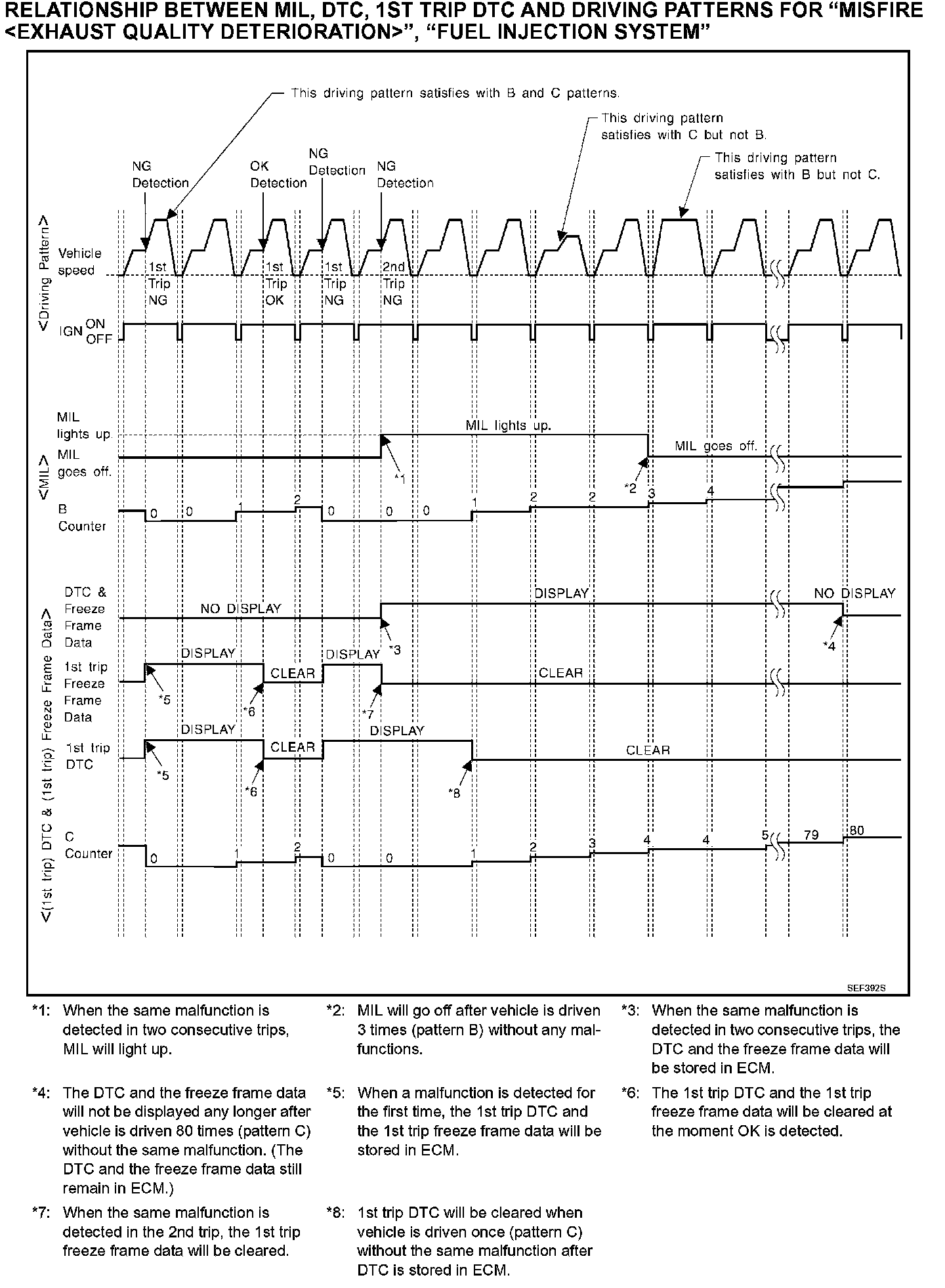 - The DTC and the freeze frame data will be stored until the vehicle is driven 40 times (driving pattern A) without the same malfunction recurring (except for Misfire and Fuel Injection System). For Misfire and Fuel Injection System, the DTC and freeze frame data will be stored until the vehicle is driven 80 times (driving pattern C) without the same malfunction recurring. The "TIME" in "SELF-DIAGNOSTIC RESULTS" mode of CONSULT-III will count the number of times the vehicle is driven.