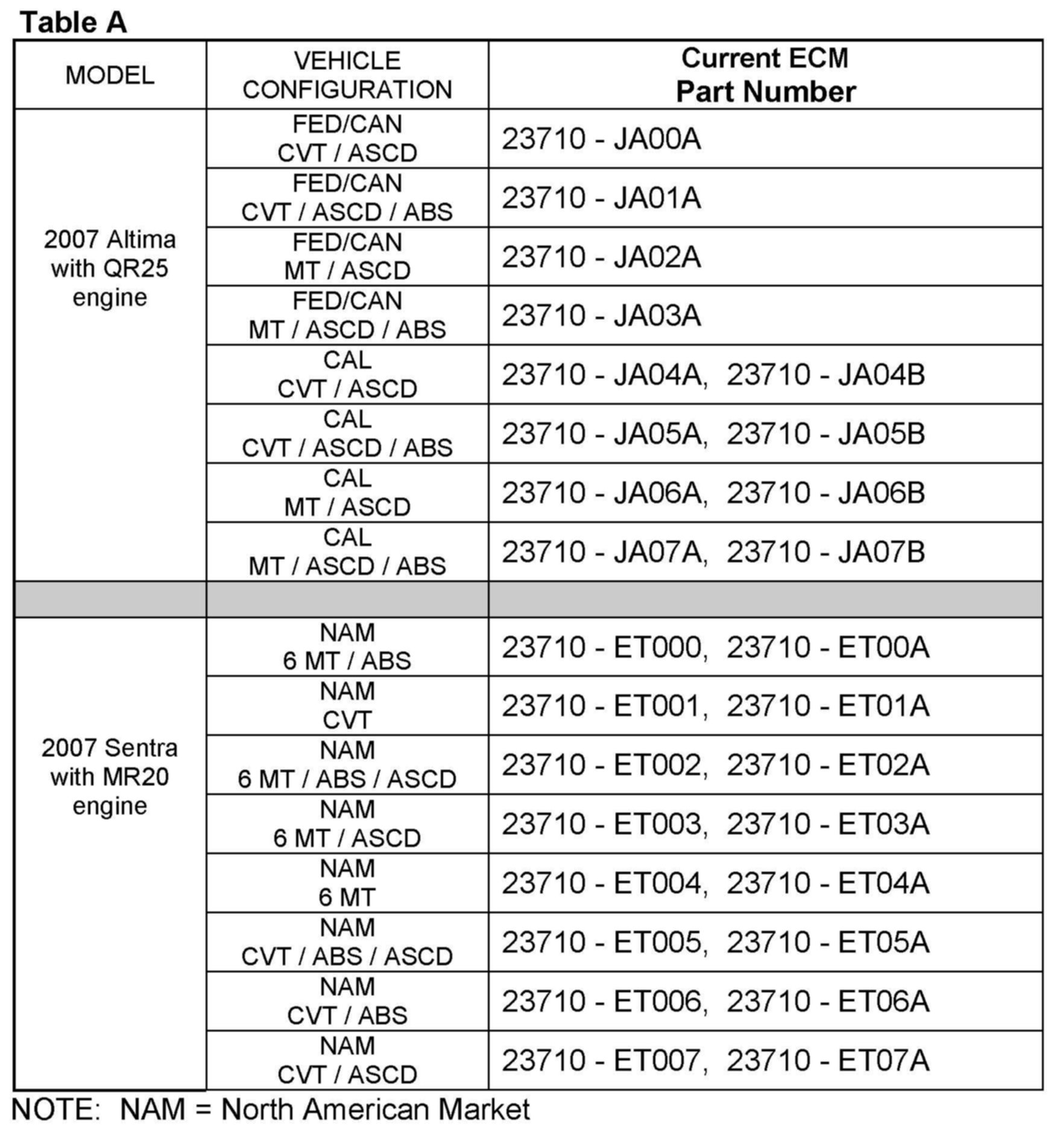 2007 Altima (L32) with QR25 engine (excludes Hybrid). 2007 Sentra (B16) with MR20 engine.