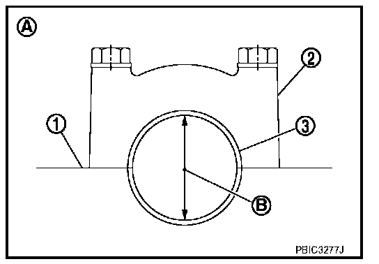 ^ When main bearing cap is removed after being tightened to the specified torque with main bearings (1) installed, the tip end of bearing must protrude (B).