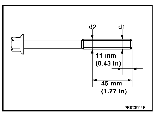 Cylinder head bolts are tightened by plastic zone tightening method. Whenever the size difference between "d1" and "d2" exceeds the limit, replace them with a new one.