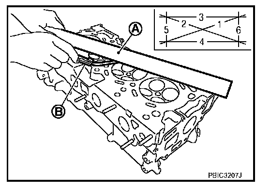 At each of several locations on bottom surface of cylinder head, measure the distortion in six directions using straightedge (A) and feeler gauge (B).
