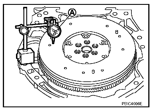 FLYWHEEL DEFLECTION (M/T MODELS)^ Measure the deflection of flywheel contact surface to clutch with a dial indicator (A).