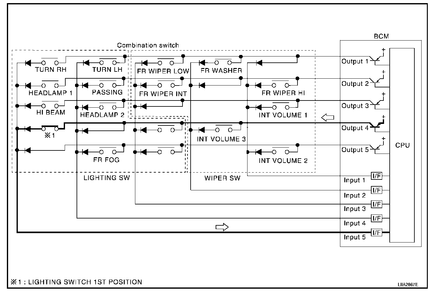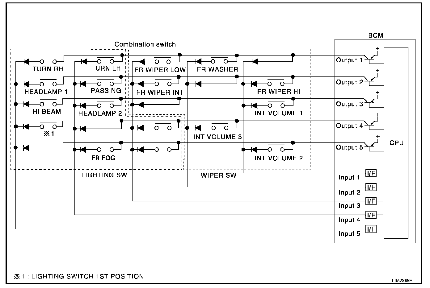 - When lighting switch 1st position is turned ON, contact in combination switch turns ON. At this time if OUTPUT 4 transistor is activated, BCM detects that voltage changes in INPUT 5.