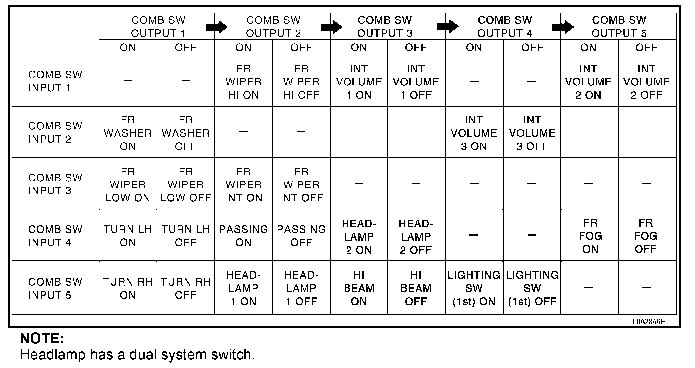 - BCM reads operation status of combination switch by the combination shown in the given table.