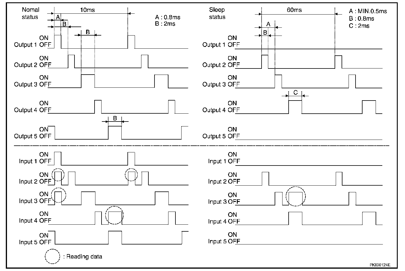 - When BCM is not in sleep status, OUTPUT terminals (1-5) each turn ON-OFF every 10 ms.