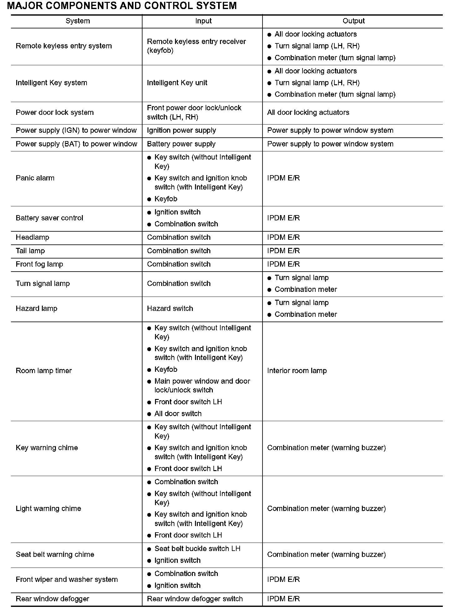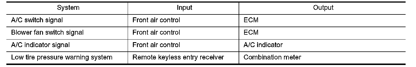 BCM has a combination switch reading function for reading the operation of combination switches (light, wiper, washer, turn signal) in addition to the function for controlling the operation of various electrical components. Also, it functions as an interface that receives signals from the front air control, and sends signals to ECM using CAN communication.