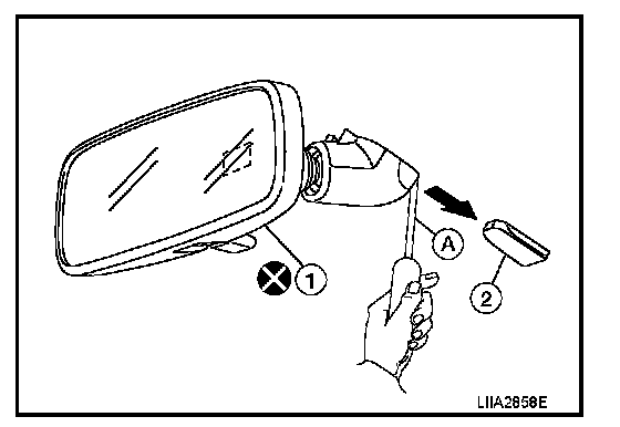 Insert a suitable tool to release the inside mirror (A). Slide the inside mirror (1) upward and remove the inside mirror from the base (2).