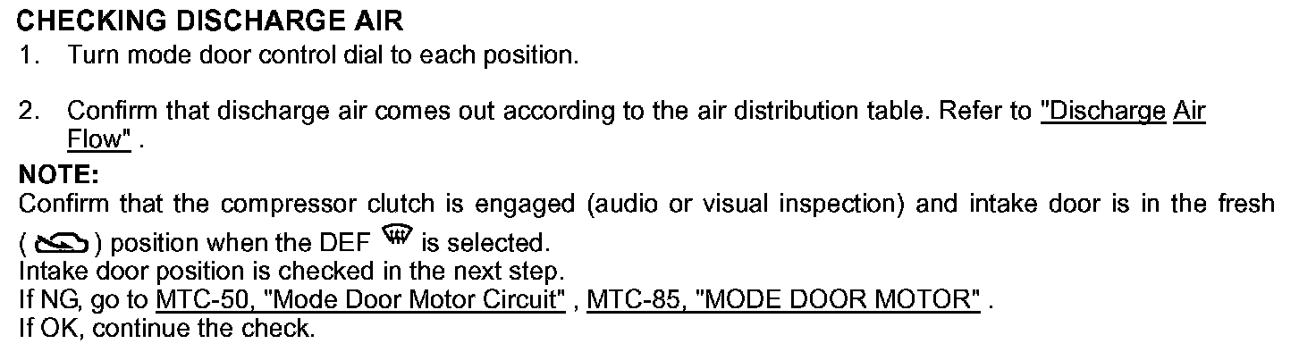 If NG, go to MTC-44, "Power Supply and Ground Circuit for Front Air Control", Power Supply and Ground Circuit For Front Air Control then if necessary, MTC-62, "Magnet Clutch Circuit". Magnet Clutch Circuit