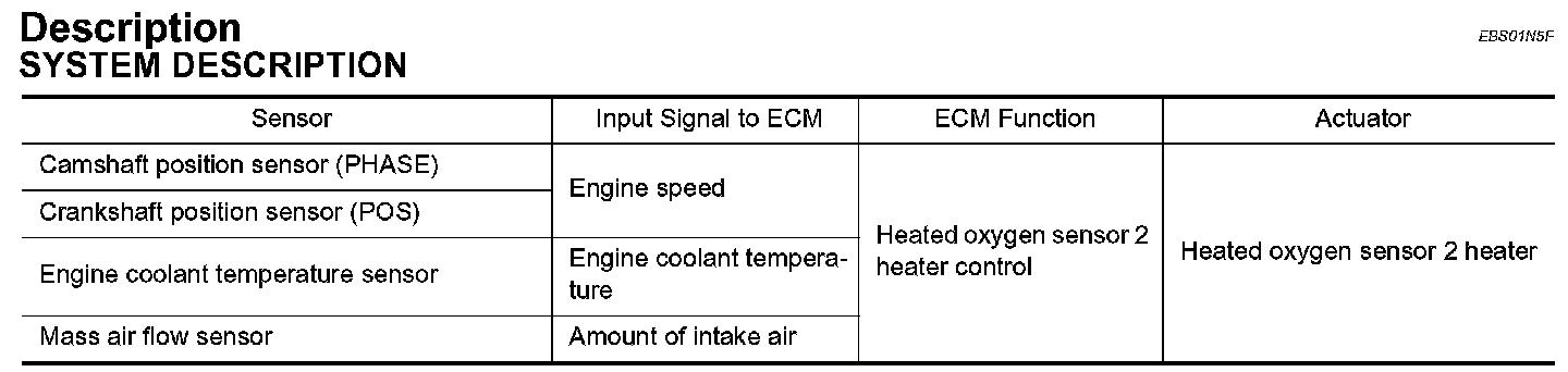 The ECM performs ON/OFF control of the heated oxygen sensor 2 heater corresponding to the engine speed, amount of intake air and engine coolant temperature.