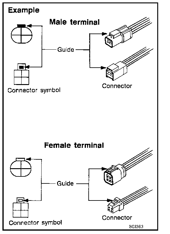 Connector guides for male terminals are shown in black and female terminals in white in wiring diagrams.