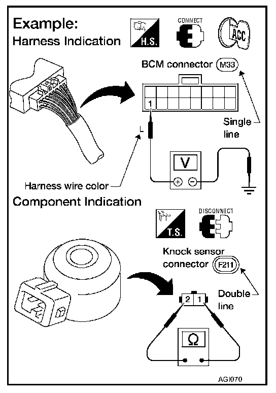 - A line with regular weight (wider line) represents a "detectable line for DTC (Diagnostic Trouble Code)". A "detectable line for DTC" is a circuit in which ECM can detect its malfunctions with the on board diagnostic system.