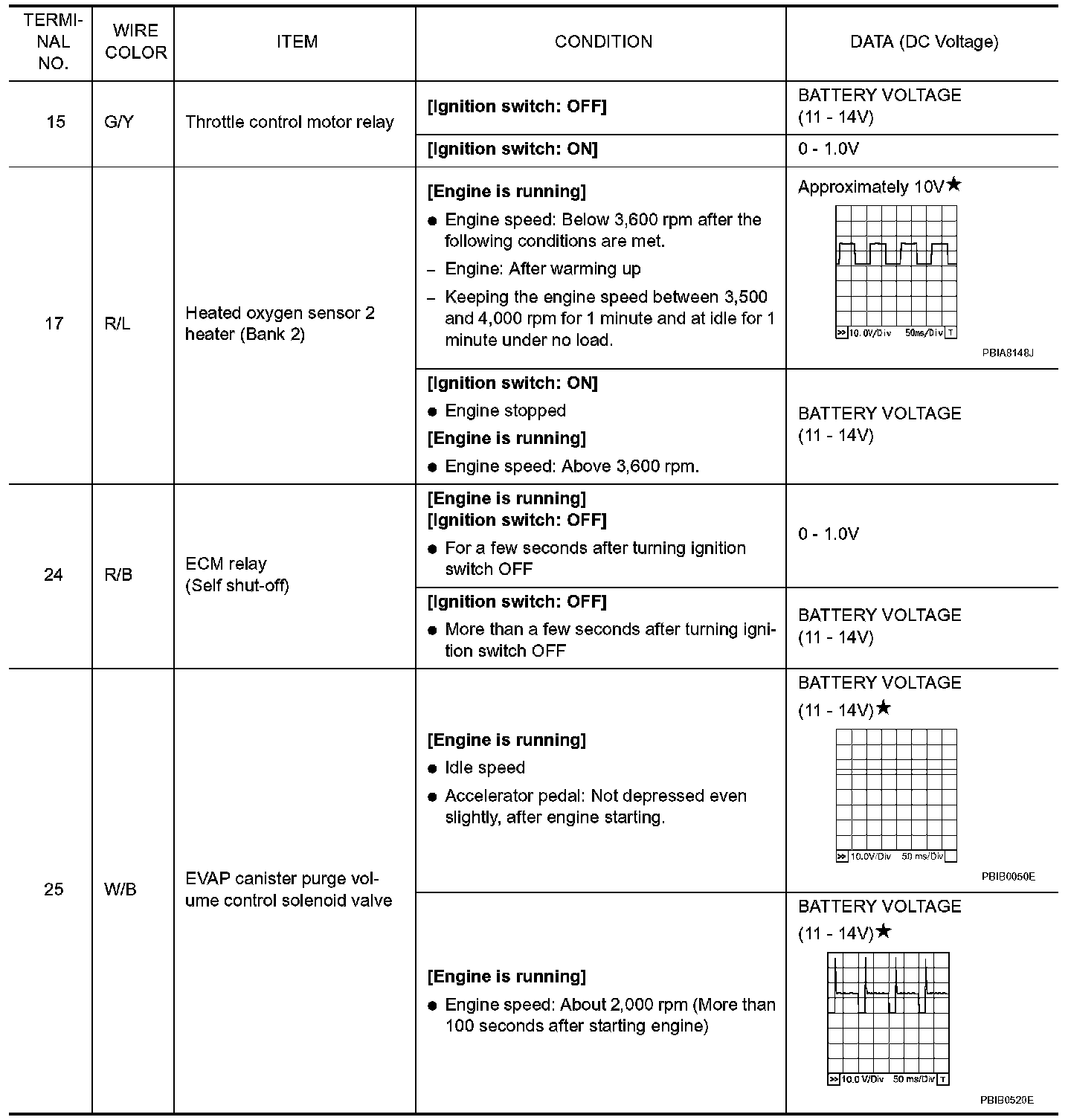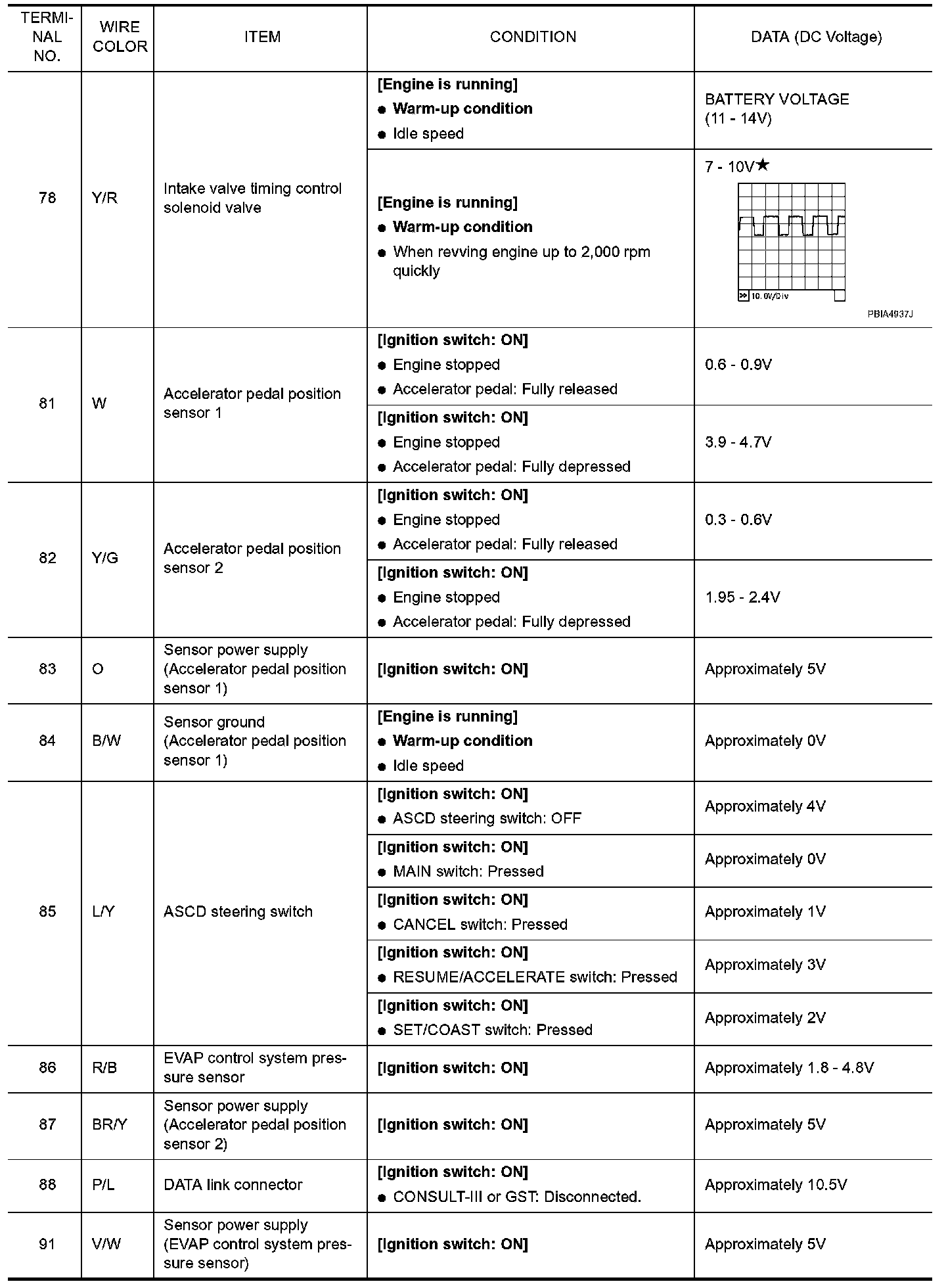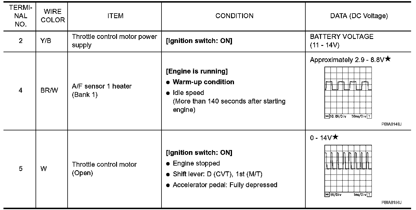 Specification data are reference values and are measured between each terminal and ground. Pulse signal is measured by CONSULT-III.
