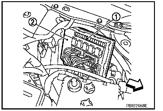 7. Remove fuel pump fuse (1) in IPDM E/R (2) to release fuel pressure.