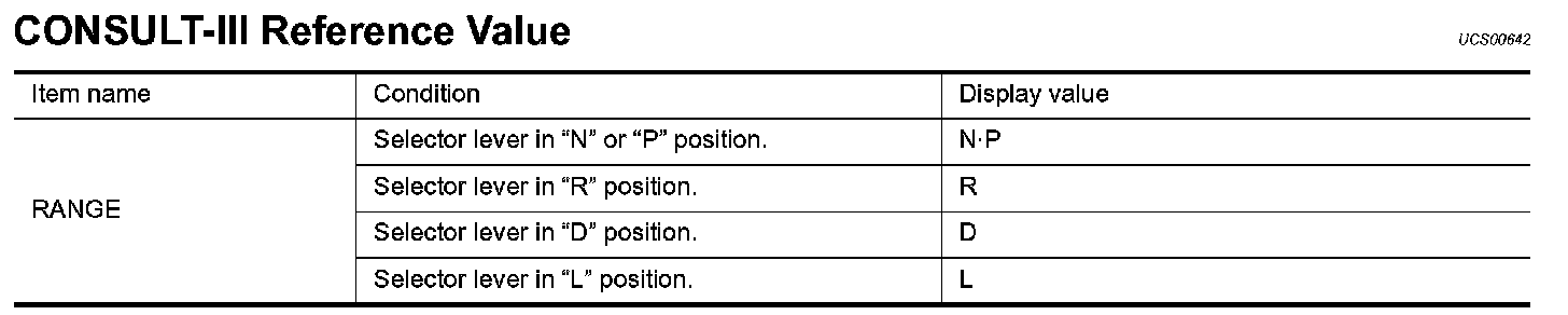 2. Select MAIN SIGNALS in DATA MONITOR mode for TRANSMISSION with CONSULT-III and read out the value of RANGE.