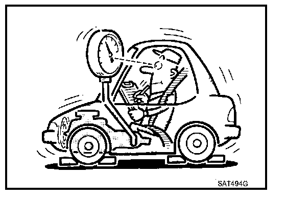 Check line pressure at idle. Refer to CVT-40, "LINE PRESSURE TEST". Line Pressure Test
