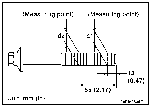 Cylinder head bolts are tightened by plastic zone tightening method. Whenever the size difference between d1 and d2 exceeds the limit, replace the bolts with new ones.