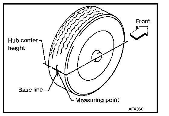 3. Put a mark on base line of the tread (rear side) of both tires at the same height of hub center. These are measuring points.