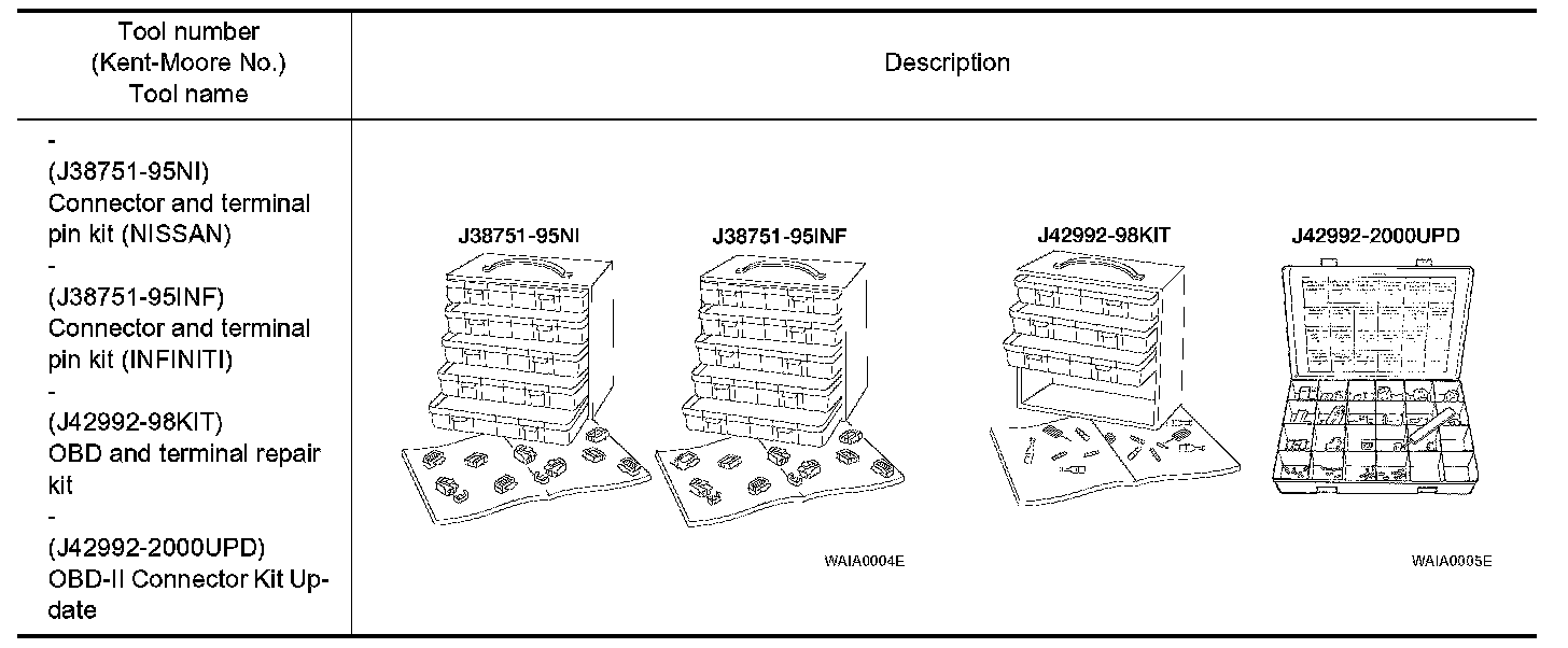 The connector and terminal pin kits contain some of the most commonly used NISSAN/INFINITI connectors and terminals. For detailed connector and terminal pin replacement procedures, refer to the latest NISSAN/INFINITI CONNECTOR AND TERMINAL PIN.