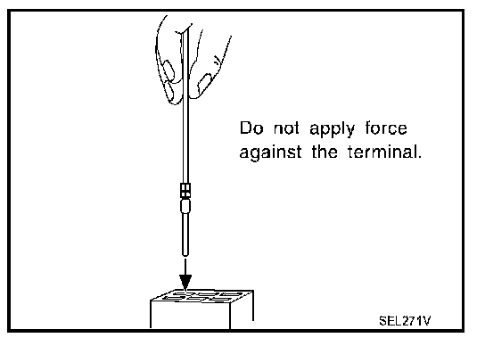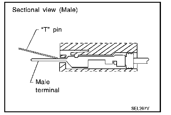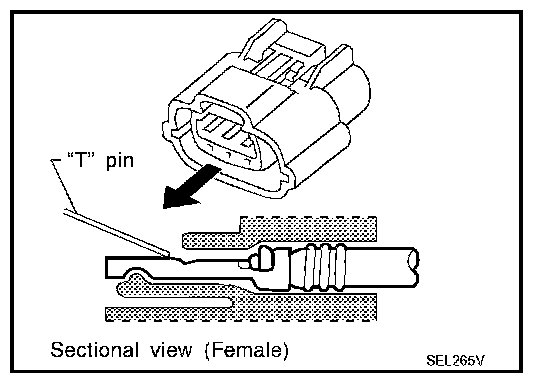 The probe of a digital multimeter (DMM) may not correctly fit the connector cavity. To correctly probe the connector, follow the procedures below using a "T" pin. For the best contact grasp the "T" pin using an alligator clip.