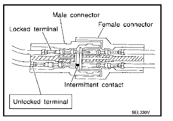 If the intermittent open circuit occurs, follow the procedure below to inspect for open wires and enlarged contact spring of female terminal.