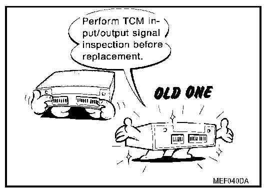 ^ Before replacing TCM, perform TCM input/output signal inspection and make sure whether TCM functions properly or not. CVT-49, "TERMINALS AND REFERENCE VALUES FOR TCM". Pinout Values and Diagnostic Parameters