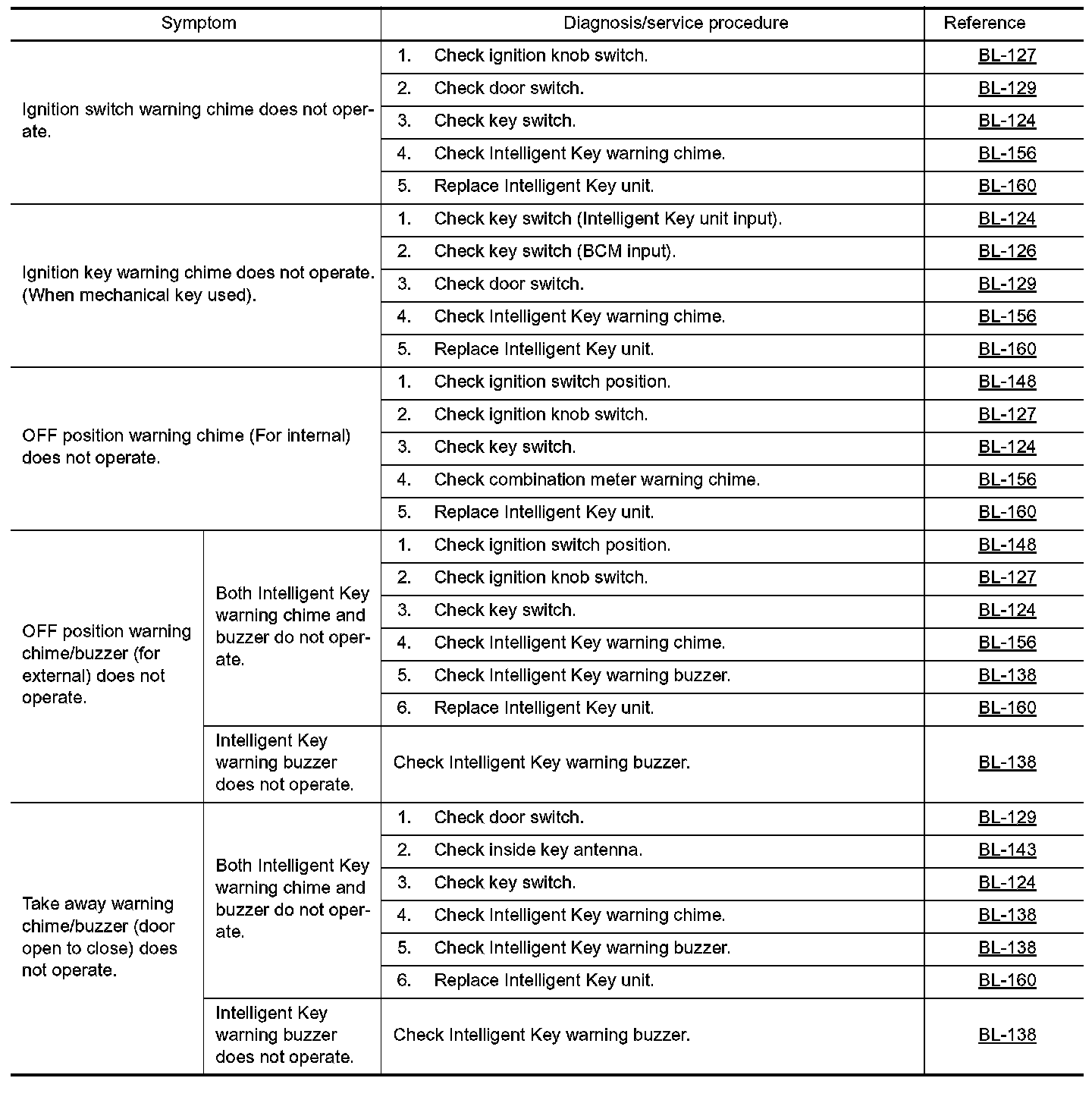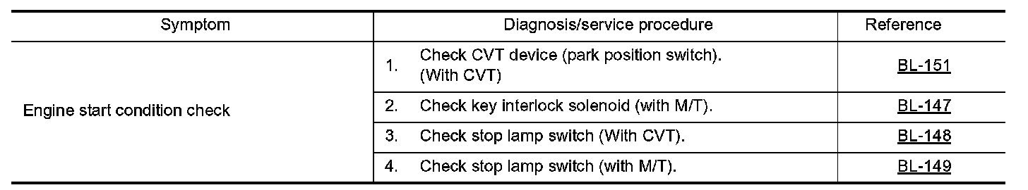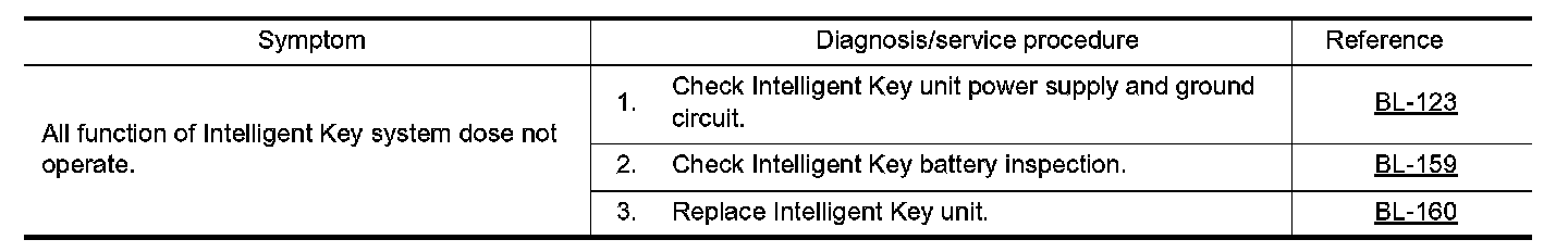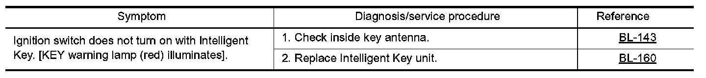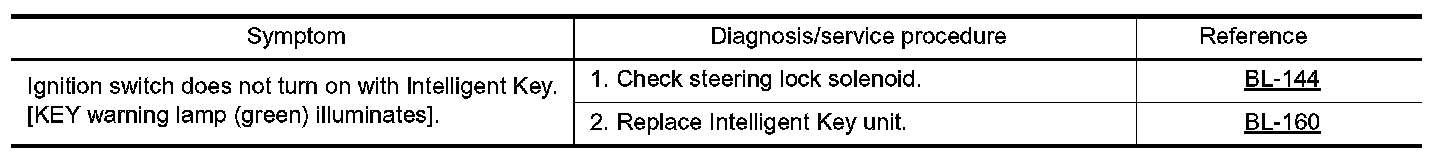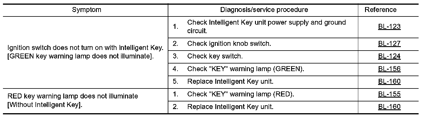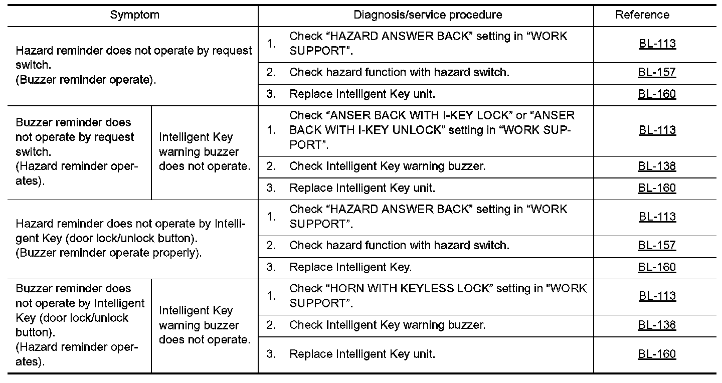 - Before performing the diagnosis in the following table, check "Trouble Diagnosis Procedure". Refer to BL- 109, "Trouble Diagnosis Procedure". Preliminary Check