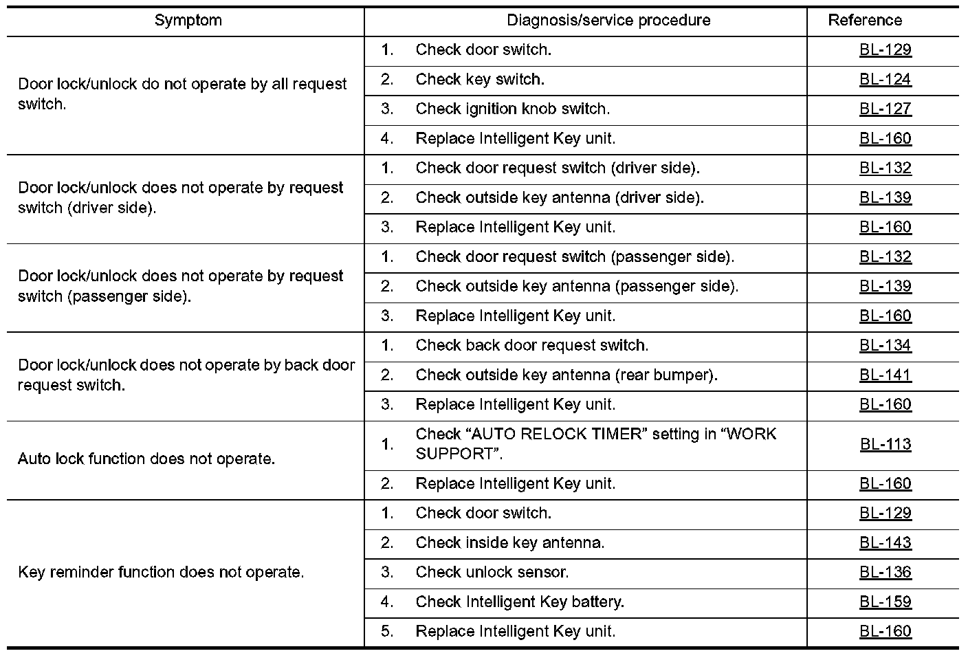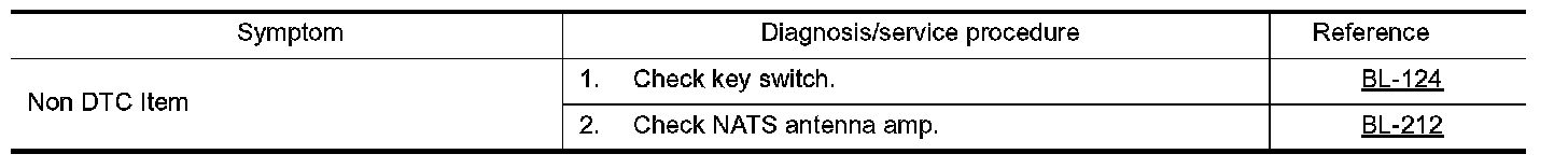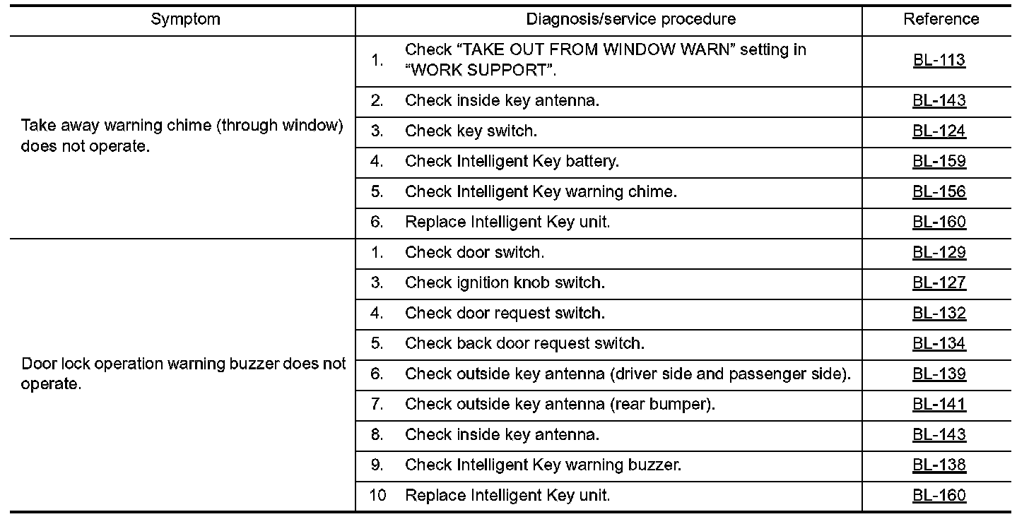 - Before performing the diagnosis in the following table, check "Trouble Diagnosis Procedure". Refer to BL-109, "Trouble Diagnosis Procedure". Preliminary Check