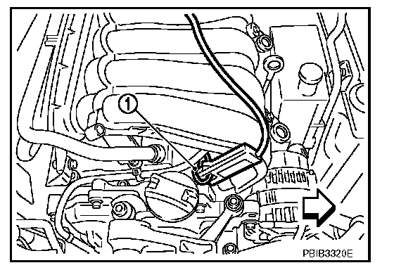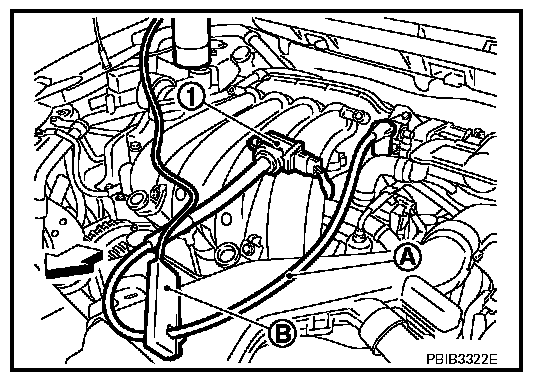 2. Connect No. 4 ignition coil (1) and No. 4 spark plug with suitable high-tension wire (A) as shown, and attach timing light clamp (B) to this wire.