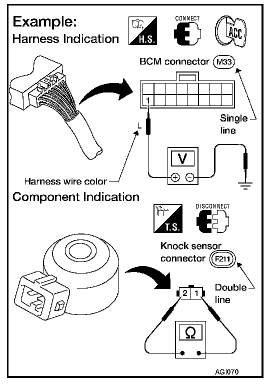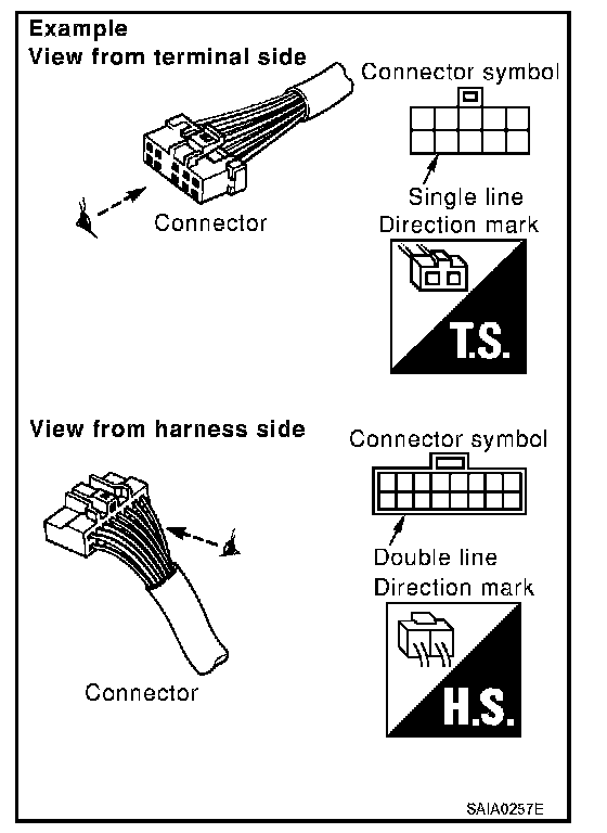 - Connector symbols shown from the harness side are enclosed by a double line and followed by the direction mark.