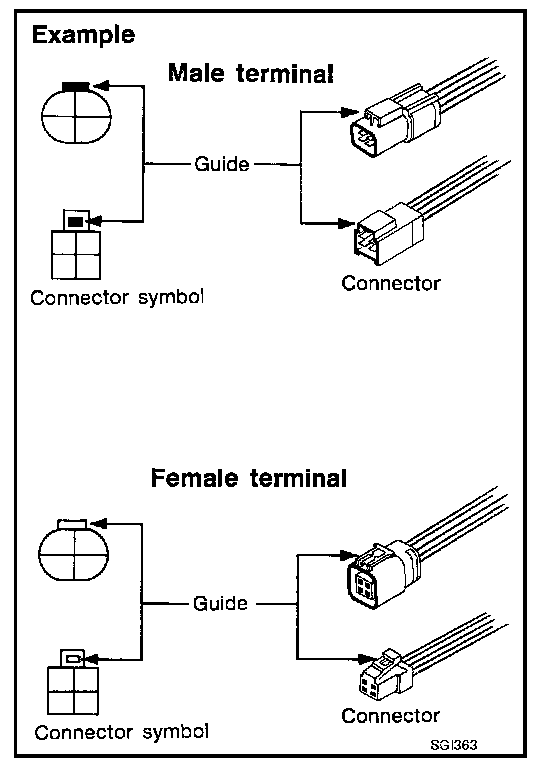 Connector guides for male terminals are shown in black and female terminals in white in wiring diagrams.