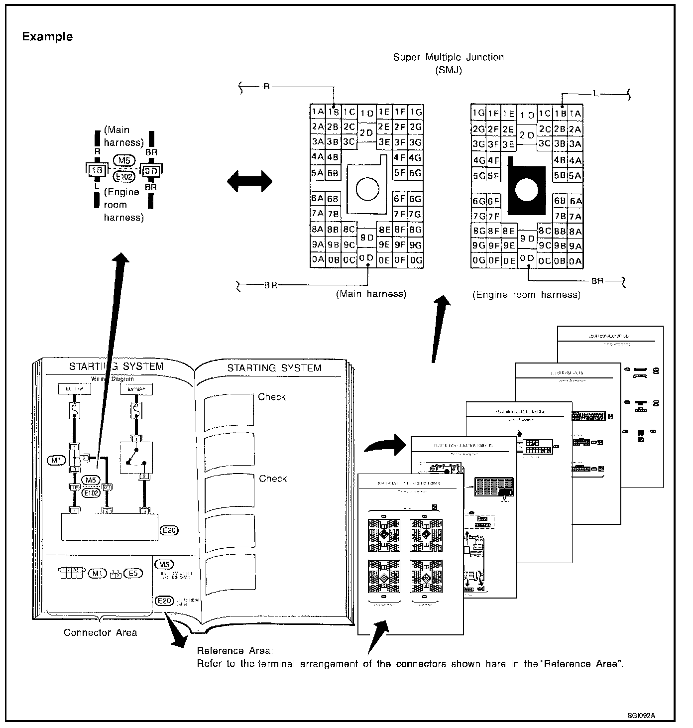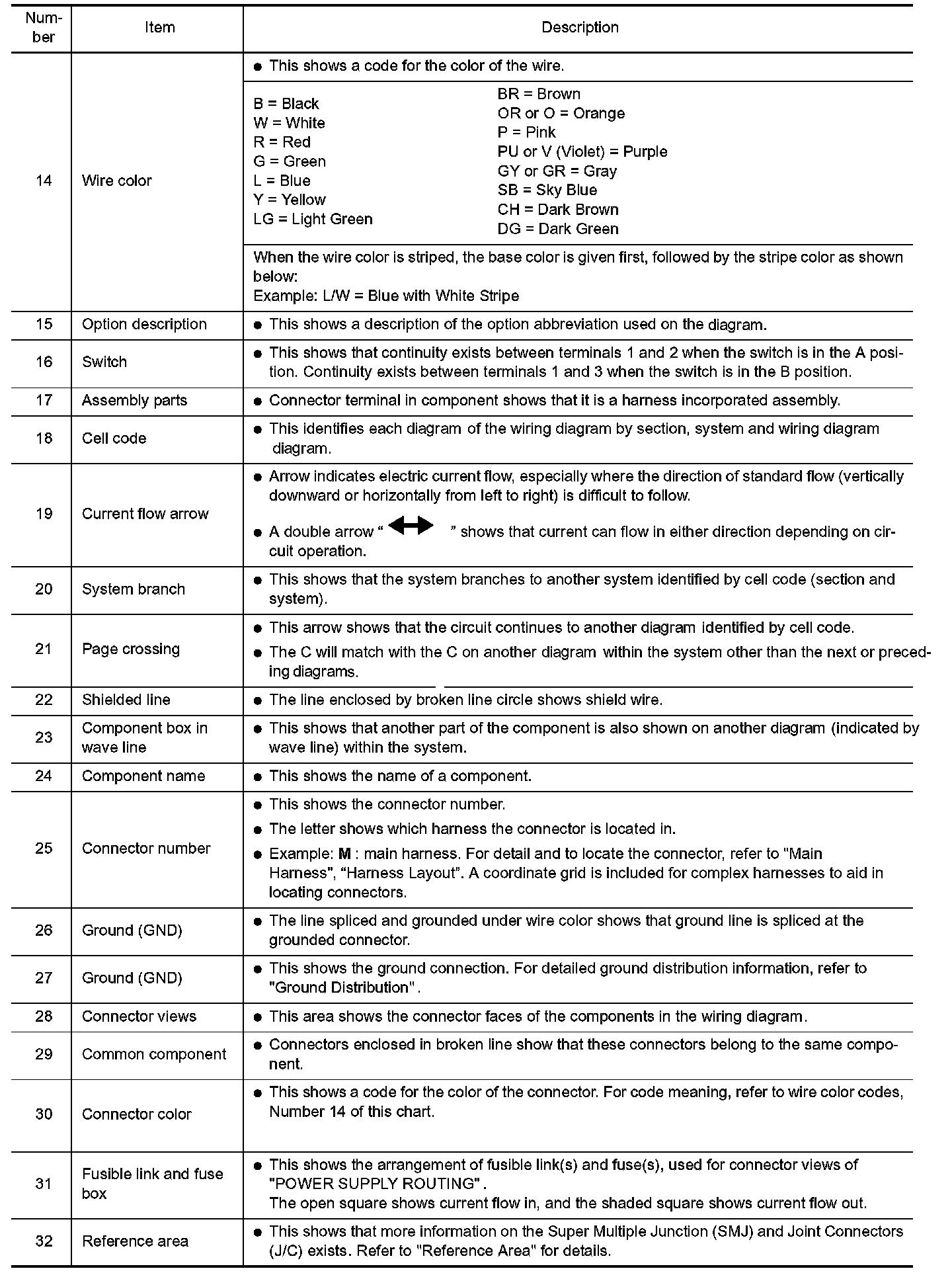 The Reference Area of the wiring diagram contains references to additional electrical reference pages at the end of the manual. If connector numbers and titles are shown in the Reference Area of the wiring diagram, these connector symbols are not shown in the Connector Area.