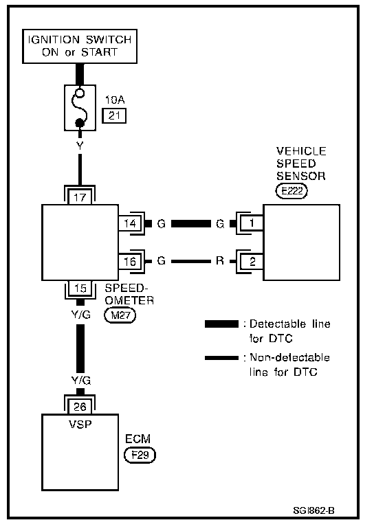 - A line with regular weight (wider line) represents a "detectable line for DTC (Diagnostic Trouble Code)". A "detectable line for DTC" is a circuit in which ECM can detect its malfunctions with the on board diagnostic system.