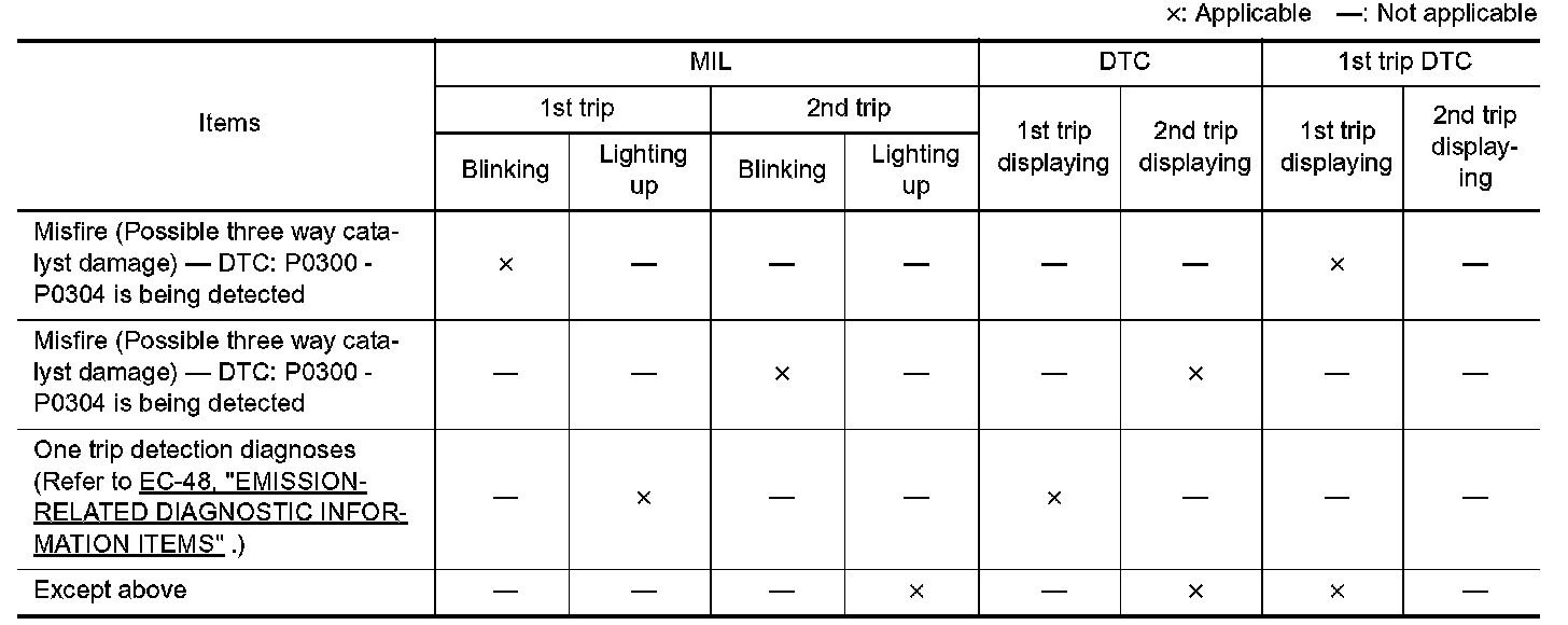 If the same malfunction is detected again during the next drive, the DTC and Freeze Frame data are stored in the ECM memory, and the MIL lights up. The MIL lights up at the same time when the DTC is stored. <2nd trip> The "trip" in the "Two Trip Detection Logic" means a driving mode in which self-diagnosis is performed during vehicle operation. Specific on board diagnostic items will cause the ECM to light up or blink the MIL, and store DTC and Freeze Frame data, even in the 1st trip, as shown.