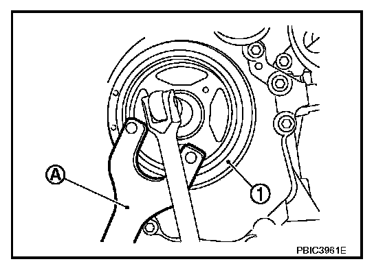 Secure crankshaft pulley (1) using tool (A).